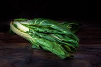 Koop de foto Snijbiet of mal, rauwe biologische bladgroente tegen een donkere houten achtergrond met kopieerruimt van Maren Winter op canvas, aluminium dibond, (ingelijste) fotoprint, behang en ArtFrame, op maat geprint in Fine-Art kwaliteit.