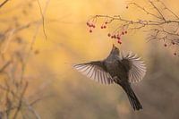 Merelvrouwtje, badend in prachtig herfstlicht, dat de laatste besjes van de meidoorn snoept.