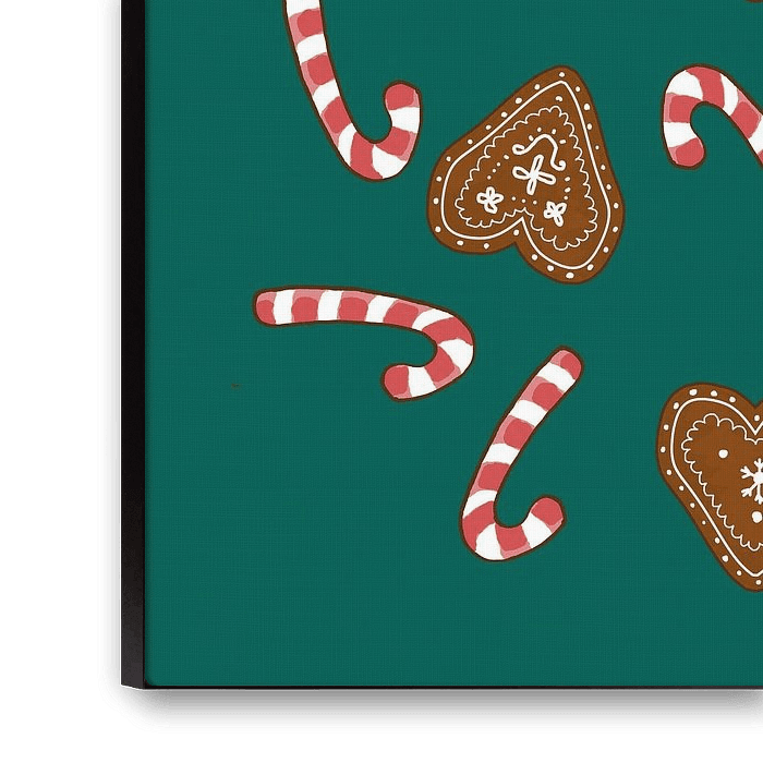 Wervelende zuurstokken dansen tussen de harten van peperkoek, elk liefdevol versierd met icing swirls en kleine suikersterren. De illustratie voelt aan als een fluistering van een besneeuwde decemberavond - warme keukens gloeiend met kaarslicht, gelach en de geur van kaneel in de lucht.