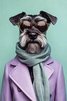 Deze schnauzer draagt een elegante paarse vacht en een modieuze zonnebril en straalt charmante nonchalance uit. Zijn opvallende snor en pluizige oren geven hem een vleugje persoonlijkheid, terwijl de zachte sjaal hem beschermt tegen de kille wind. Een echte fashionista van de hondenwereld, die in stijl over straat flaneert!