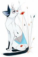 Dit digitale cartoonachtige kunstwerk toont een kat die een bloem opsnuift mond, tegen een serene achtergrond. De speelse en elegante houding van de kat creëert een gevoel van gratie en vreugde. Perfect voor liefhebbers van katten en natuurkunst, dit stuk zal elke ruimte een gevoel van speelsheid en schoonheid geven.