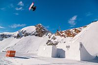 Snowboarder hangt hoog in de lucht in het Oostenrijkse Stubai. Deze foto werd genomen tijdens Prime Park Sessions - een evenement waarbij de grootste aktiesport namen bij elkaar komen om hoog door de lucht te vliegen