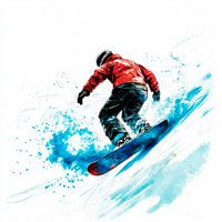 Een dappere snowboarder snijdt krachtig door de sneeuwgolf terwijl felblauwe spetters om hem heen dansen. In zijn rode outfit straalt hij energie en een gevoel van avontuur uit terwijl hij geniet van de vrijheid van de besneeuwde bergen. Deze dynamische scène geeft perfect het gevoel van snelheid en ongerepte winterse magie weer.