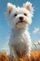 Met zijn neus in de lucht en pootjes in het goudgele gras geniet deze pluizige viervoeter zichtbaar van de zomer. Snuit in de wind is een vrolijk en licht schilderachtig portret vol textuur, zonlicht en speelse energie. De compositie – laag standpunt, helderblauwe lucht, warme gloed – maakt dit werk tot een echte sfeermaker aan de muur.