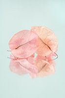 Deze plant heeft vrolijk gekleurde schutbaden, deze zitten om de echte bloemetjes heen. Deze schutbladen zijn met de zaden van de plant van de plant afgevallen en gedroogd in het heerlijke warme Spaanse zonnetje. Hierdoor is het blad meer doorzichtiger geworden en lichter van kleur en de nerven zijn hierdoor veel beter te zien. De zacht roze en oranje pastelkleuren geven een rustige uitstraling aan de foto. De blaadjes liggen op een aparte ondergrond waardoor ze op een abstracte wijze gespiegeld worden. Het spiegelbeeld lijkt bijna schilderachtig. Als je inzoomt op de foto is dit goed te zien. De achtergrond heeft ook een pastelkleur, die ik zelf zou omschrijven als licht turquoise.
