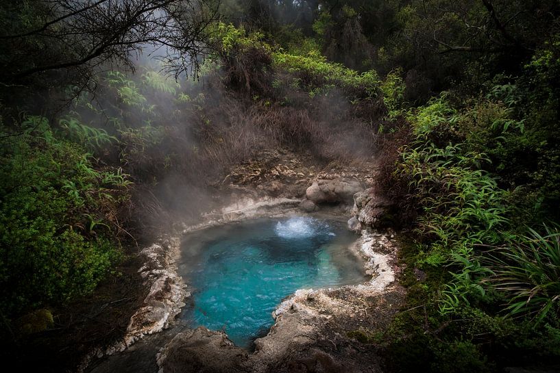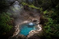 Reis mee naar deze magische plek: Soda Fountain in het Orakei Korako Geothermal Park op het Noordereiland van Nieuw Zeeland. Het knalblauwe, kokende water omringd door de mooie groene vegetatatie, vol met druppels van de het stomende water. Een echt geothermisch pareltje.