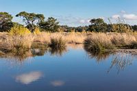 Meertje in de Soester Duinen, Utrechtse Heuvelrug. Het meertje is omzoomd met riet en berken bomen in herfstkleuren