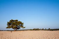 Een alleenstaande boom in soesterduinen afgestempeld tegen de strakblauwe lucht