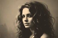 Vintage sepia portret van een vrouw met lang krullend haar.