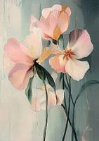 Soft Bloom Elegance - Dit bloemen schilderij toont twee grote, zachtroze bloemen, subtiel benadrukt met gouden details tegen een zachtgroene achtergrond, die een delicaat en stijlvol gevoel geven.