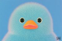Soft Blue Innocence - Dit vogelschilderij toont een pluizige, jonge blaauwe eend dicht in beeld, met grote, ronde, schattige ogen en een duidelijk oranje snavel tegen een zachte blauwe achtergrond, wat een gevoel van kalmte en zachtheid oproept.
