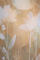 Een subtiel Japandi kunstwerk waarin zachte bloemblaadjes en bladeren in transparante lagen samenvloeien met aardse zandtinten. De verfstructuur en lichte penseelstreken creëren een serene, bijna dromerige sfeer. Perfect voor wie houdt van minimalistisch design, wabi-sabi rust en natuurlijke eenvoud.