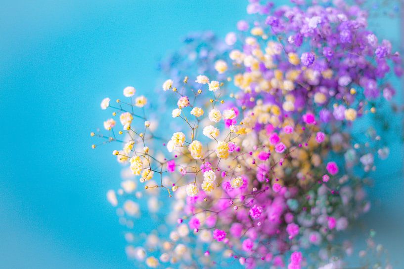 Een zachte bloemenstudie waarin fijne pastelbloemen lijken te zweven tegen een lichte turquoise achtergrond. De subtiele focus en dromerige kleuren geven het beeld een bijna etherische uitstraling, alsof de bloemen oplossen in licht. Deze fine art botanische fotografie draait om sfeer, zachtheid en kleur — een verstild moment gevangen…