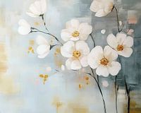 Soft Echoes of Spring Blooms - Dit bloemen schilderij toont een verzameling van delicate witte bloemen met gouden hartjes, geschilderd tegen een zachtblauw en grijs achtergrond die een rustgevend en vredig gevoel opwekt.