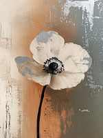 Soft Edges, Hard Center - Dit bloemen schilderij toont een prominente, gestileerde witte papaver met een opvallend zwart hart, geflankeerd door abstracte penseelstreken in tinten van beige, wit en donkergrijs.