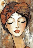 Soft Elegance of Thought - Dit portret schilderij toont een vrouw met gesloten ogen, wiens sereniteit wordt benadrukt door zachte bruine en beige tinten, en een artistiek gedecoreerde hoofdband die complexe, organische vormen omvat.