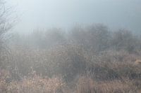 In dit werk zie je een landschap dat langzaam oplost in nevel. Struiken, gras en bomen tekenen zich slechts gedeeltelijk af, alsof ze zich niet helemaal prijsgeven. Het licht is diffuus en zacht, waardoor vormen hun scherpte verliezen en plaatsmaken voor lagen. Pas wanneer je langer kijkt, worden kleine details zichtbaar: dor gras op de…