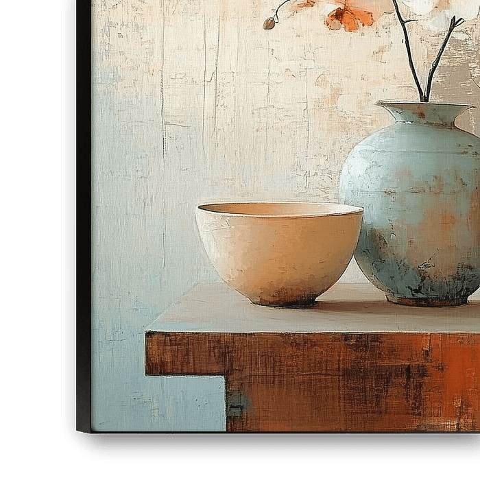 Soft Orchid Pause - Dit bloemen schilderij toont een rustgevend stilleven van witte orchideeën in een vervlogen turkoois vaasje, begeleid door een ongedefinieerde witte kan en een eenvoudige crèmekleurige schaal, allemaal samengebracht op een stevige houten tafel tegen een zacht getextureerde achtergrond in tinten van beige en oranje.