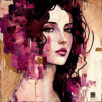 Portret van een mooie vrouw. Sterk en zacht tegelijkertijd. Organische vormen afgewisseld met strakke blokvormen. De kleurstelling is roze, aubergine, beige, zwart en wit. Abstract en verfijnd. Passen bij diverse stijlen en trends.