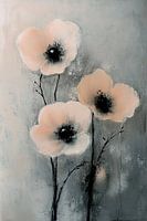 Soft Silence Blooms - Dit bloemen schilderij toont drie zacht roze papaverbloemen op lange stelen, prachtig geplaatst tegen een gedempt grijsachtig achtergrond, waarbij de centrale bloem de aandacht trekt door een suggestief donker hart te tonen.