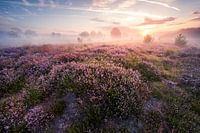 Door de mist ontstond er deze ochtend een kleurrijke maar zachte zonsopkomst. De Heide kleurde hierdoor lekker mee wat resulteerde in deze sfeervolle heidefoto.