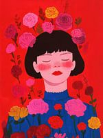 Dit expressieve kunstwerk toont een vrouw met gesloten ogen, omringd door een explosie van kleurrijke bloemen tegen een intens rode achtergrond. Haar serene gezicht, blozende wangen en de bloemen die uit haar groeien, stralen rust, kracht en zelfliefde uit. De levendige kleuren en illustratieve stijl maken dit een opvallende eyecatcher voor elke ruimte — ideaal voor wie houdt van vrouwelijke energie, emotionele diepgang en kleur.