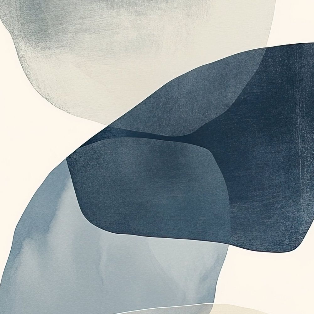 Softly Overlapping Zen Forms - Dit abstracte schilderij kenmerkt zich door overlappende, organische vormen in een zacht palet van blauw-, grijs- en beigetinten, die een kalme en harmonieuze uitstraling geven.