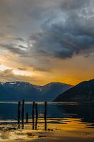 Sognefjord in Noorwegen tijdens zonsondergang met zonlicht gereflecteerd op het water in de fjord.