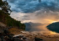 Sognefjord in Noorwegen tijdens zonsondergang in de zomer met zonlicht achter donkere wolken boven de fjord.