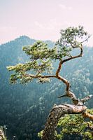 Een scheef gegroeide dennenboom op de Sokolica bergtop in de Pieniny bergen in Polen
