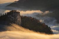 Sokolica top in het Pieniny gebergte bij mistige zonsopgang, Polen