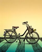 Een grafisch beeld van een solex. De plankenvloer en plint geeft een suggestie dat hij in een kamer staat.