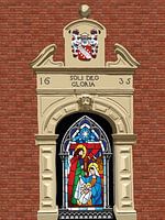 Boven de poort prijkt een prachtig wapenschild, een symbool van macht en status, dat het historisch belang van deze toegang benadrukt. Onder het wapenschild staat de tekst "SOLI DEO GLORIA", een Latijnse uitdrukking die "Alleen God de eer" betekent, wat verwijst naar de goddelijke lof en de heilige betekenis van de locatie.
