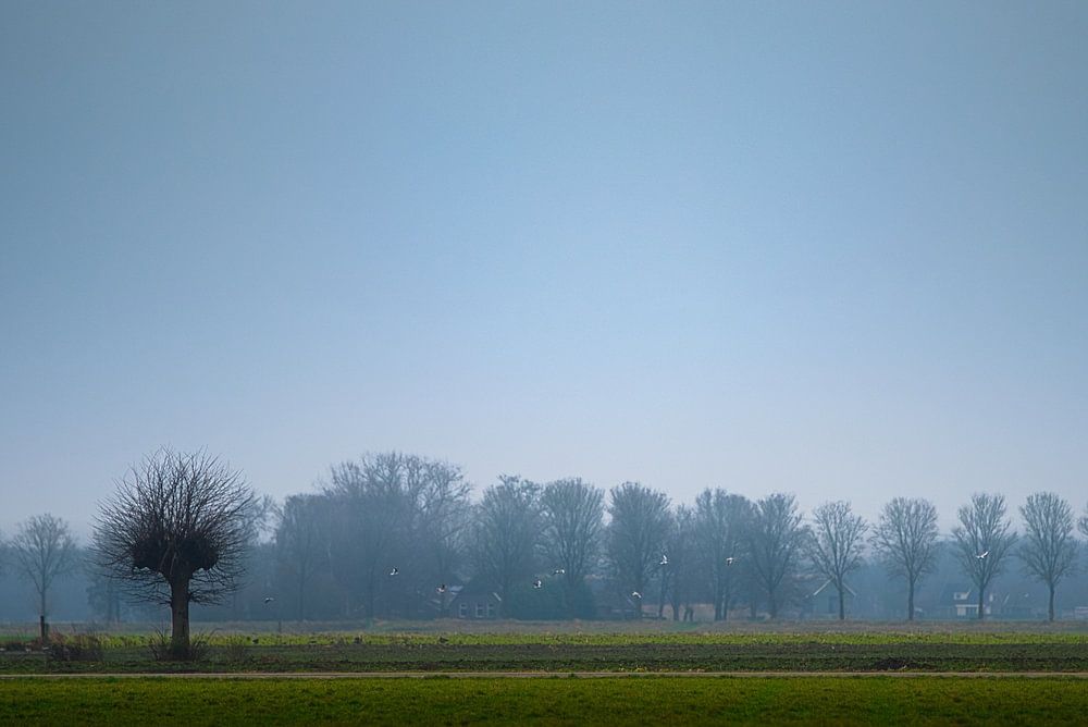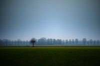 In een uitgestrekte, met mist omhulde vlakte staat één kale boom als een stille hoofdrolspeler. De lucht is zwaar en blauwgrijs, met een zachte overgang naar lichter tinten richting de horizon, alsof de dag nog moet ontwaken of juist langzaam eindigt.