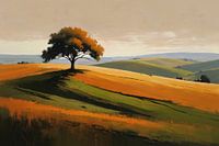 Ontdek de rust en schoonheid van het landschap met dit prachtige kunstwerk. Een solitaire boom, fier staand op de glooiende heuvels, vormt het hart van dit tafereel. De levendige oranje en gele tinten van de bladeren steken warm af tegen de koelere achtergrond, waar de zachte groene en blauwe tonen van de heuvels onder de hemel rust uitstralen. Dit stuk vangt een tijdloze essentie van de natuur en brengt een stukje van de buitenwereld in welke ruimte dan ook. Perfect voor in de slaapkamer of woonkamer, het nodigt uit tot contemplatie en is een stille getuige van de overgang van de seizoenen.