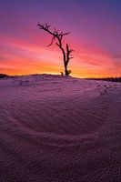 Een solitaire dode boom op een zandverstuiving. De kleuren van de zonsopkomst reflecteren mooi in de rijp op het zand.