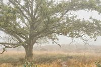 Een prachtige solitaire eikenboom in de mist op de Gortelse Heide op de Veluwe. De vorm van de boom komt beter tot zijn recht als veel verstorende elementen worden vervaagd door de mist.
