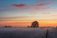 Solitaire boom tijdens een mistige dageraad op het platteland van Groningen in het voorjaar.
