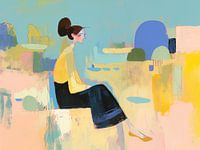 Solitude Serenade - Dit vrouwen schilderij toont een elegante jongedame zittend tegen een achtergrond van abstracte penseelstreken in een harmonie van pastelkleuren, reflecterend of diep in gedachten verzonken.