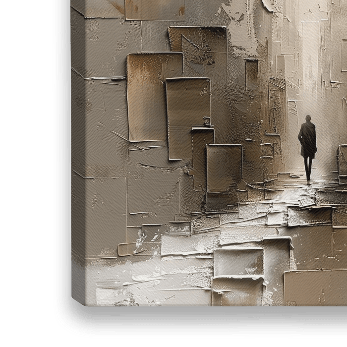 Figuratieve abstractie in naturel tinten met een grove textuur.