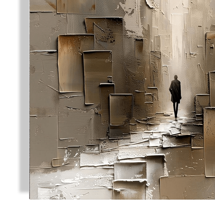 Figuratieve abstractie in naturel tinten met een grove textuur.