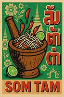 Deze retro Som Tam poster is helder, gedurfd en vol van smaak en is een eerbetoon aan de beroemde Thaise papajasalade. Het ontwerp, geïllustreerd met chilipepers, limoen en papajasnippers in een traditionele houten vijzel, weerspiegelt de frisheid en levendigheid van dit iconische gerecht. De groene, rode en natuurlijk bruine tinten, gecombineerd met bloemmotieven en Thais schrift, geven het zowel culturele diepte als retro charme. Som Tam is een hoofdbestanddeel van het Thaise straatvoedsel, bekend om zijn onweerstaanbare combinatie van pittige, zure, zoute en zoete smaken. Deze Thaise wanddecoratie is perfect voor keukens, restaurants of iedereen die van de Aziatische keuken houdt. De vintage-geïnspireerde texturen en gedurfde pop-art stijl maken het een uniek decoratief stuk dat culturele authenticiteit combineert met artistieke flair. Deze Som Tam print is ideaal voor fijnproevers, reizigers of verzamelaars van culinaire kunst en brengt de versheid van de Thaise straatmarkten rechtstreeks naar je interieur.