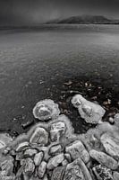 Somber maar mooi weer, ijs op de rotsen in de herfst op het Baikalmeer.