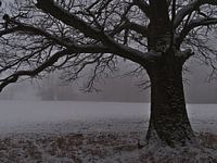 Over ‘Somber winterlandschap met een oude eik in de sneeuw met mist’ van Timon Schneider