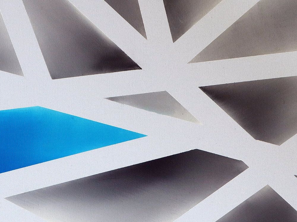 Geometrisch monoschroom abstract schilderij in grijs en wit met blauw vlak. Origineel is in olieverf