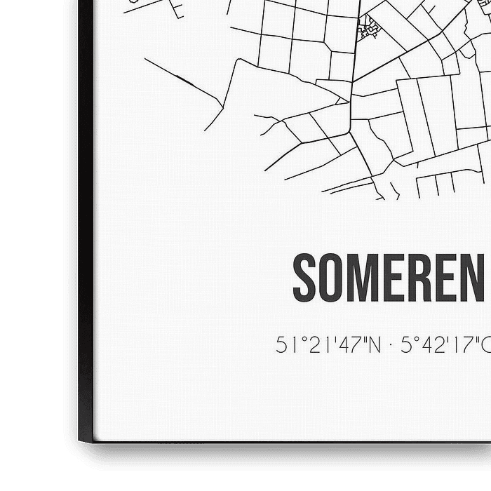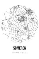 Zwart-witte landkaart, stratenplan of plattegrond van Someren. Someren is gelegen in de gemeente Someren, provincie Noord-Brabant. Op de stadskaart zijn alle openbare wegen in Someren opgenomen. Verder is de kaart voorzien van de coördinaten van het centrum van Someren.