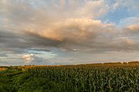 Wolken über einem Maisfeld mit einem kleinen Regenbogen in den Wolken.