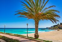 Palmboom op zandstrand Son Moll in Cala Ratjada, eiland Mallorca, Middellandse Zee Spanje, Balearen, Mallorca, Cala Rajada