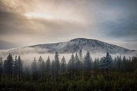 Deze artistiek bewerkte landschapsfoto toont het iconische Sonfjället-gebergte in Zweden in een moment van bijna magische rust. De zachte nevel die zich tussen de sparren en bergruggen nestelt, lijkt haast geschilderd – een dromerige sluier die het landschap verbindt met de lucht.
