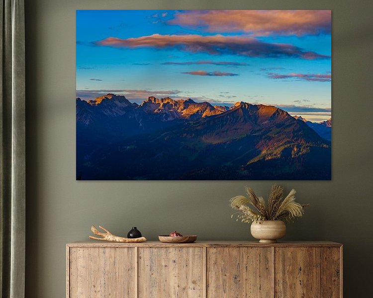 Panorama vom Rubihorn, 1957m, zum Fellhorn, 2038m, und Söllereck, 1706m, Allgäuer Alpen, Allgäu, Bayern, Deutschland, Europa
